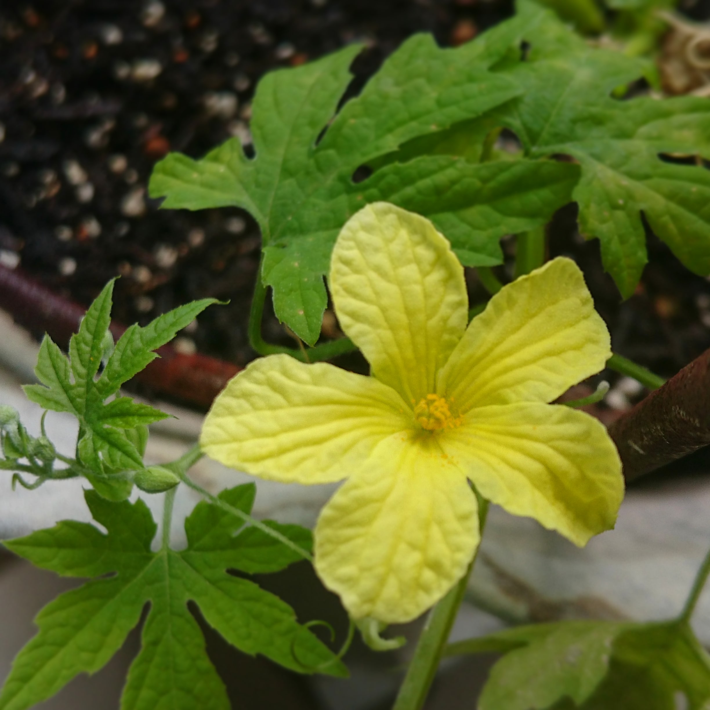 今日の花 211005 ダンナが気まぐれで庭に植えたゴーヤの種。 芽がでただけでも驚いたけど、まさか花まで咲くとは。 本来なら春先に植え付けして夏に収穫するもの。 いまから花が咲いても仕方ないから、受粉はせずにそのまま放置。 とはいえ、せっかく花をつけてくれたんだから、きちんと越冬させてやらないと可哀想だなとか思っちゃう。 PR 2021年 10月 08日| 植物|Comment(0)